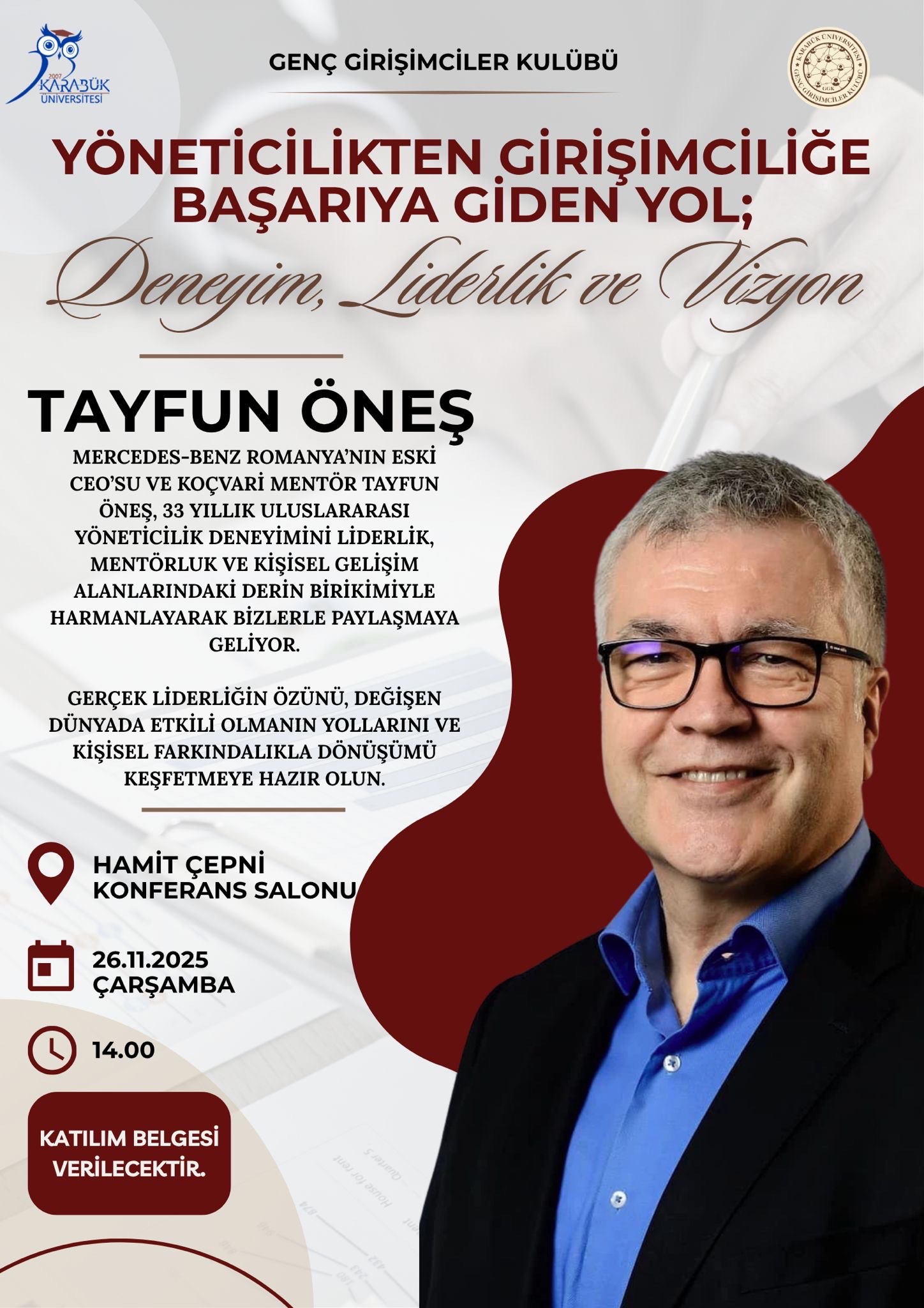 Mercedes-Benz Romanya’nın eski CEO’su ve koçvari mentör olarak tanınan Tayfun Öneş, 33 yıllık uluslararası yöneticilik deneyimini; liderlik, mentörlük ve kişisel gelişim alanlarındaki birikimiyle harmanlayarak öğrencilerimizle paylaşacak 🚀