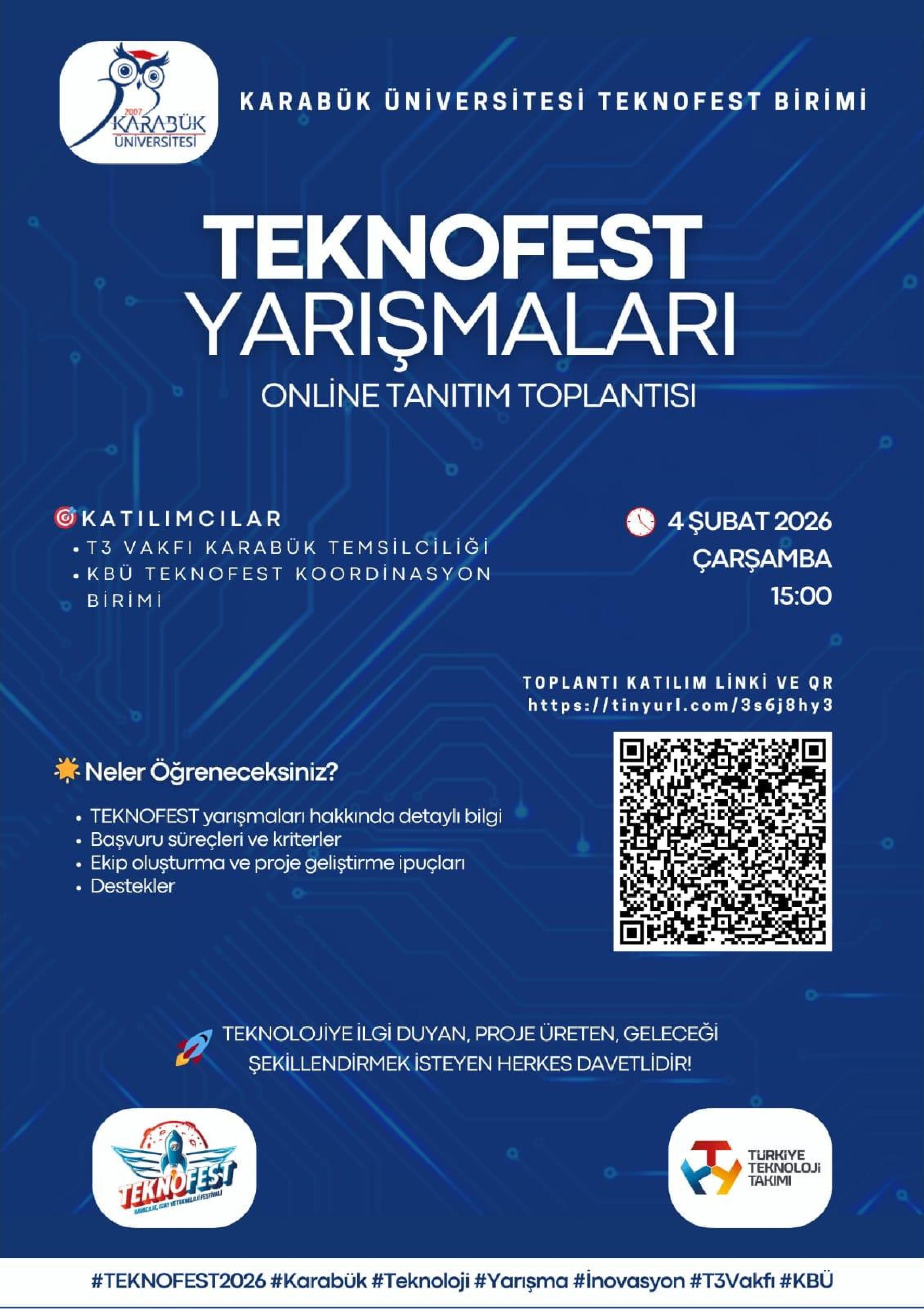 Geleceğin teknolojilerini geliştirmeyi hedefleyen gençler için TEKNOFEST, 2026 yılında da kapılarını sonuna kadar açıyor. Geçtiğimiz yıl milyonlarca gencin katılımıyla gerçekleşen bu dev serüven, bu yıl daha kapsamlı ve daha heyecanlı!
