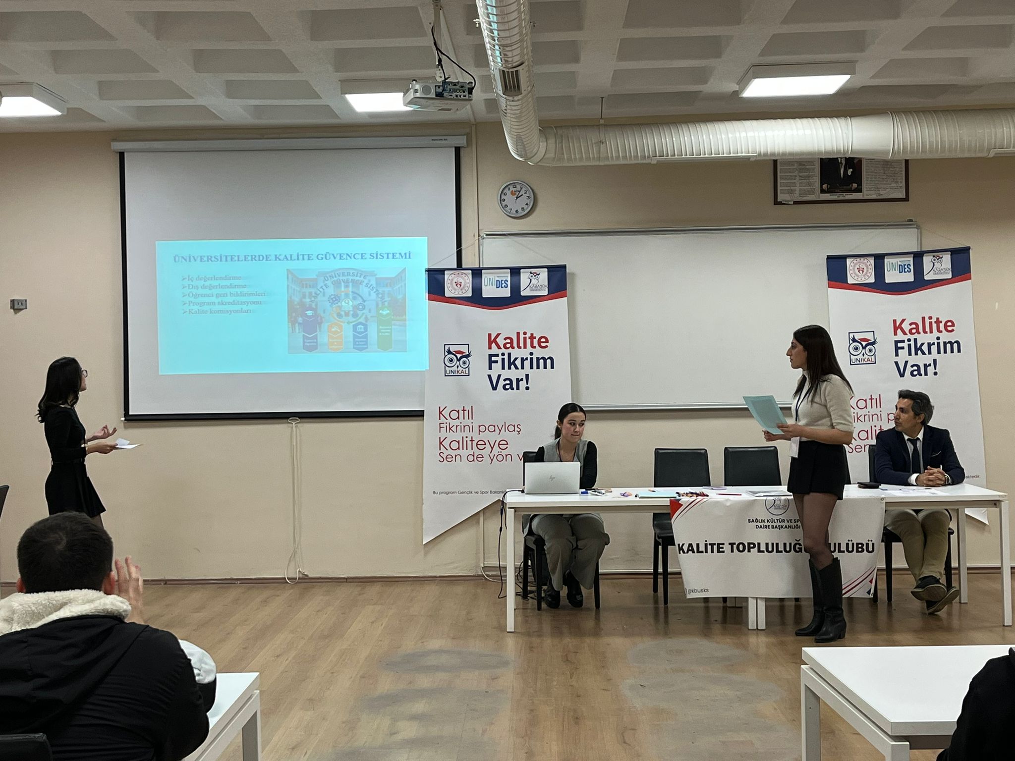 Kalite Topluluğu Kulübü tarafından düzenlenen “Kalite Fikrim Var” başlıklı etkinlik fakültemizde gerçekleştirildi. Kulüp danışmanı Doç. Dr. Bülent ORAL’ın öncülüğünde, kulüp yönetimindeki öğrenciler tarafından kalite konusunda bilgilendirme yapılması, kalite süreçlerine dahil olunması ve fikirlerin alınması amacıyla dört sunum ve bir atölye çalışması düzenlendi. Bu etkinliklerle, üniversitenin iyileştirmeye açık alanlarına yönelik fikir ve çözüm önerileri ele alındı.